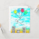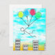 Personaje de caricatura usando globos para sobrevolar la ciudad. Imagen digital.