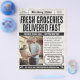 Ofrezca ofertas nuevas con este folleto de estilo periódico vintage diseñado para los servicios de entrega de comestibles. Este folleto de personalizable, con titulares atrevidos y un diseño de periódico clásico, es perfecto para promocionar sus opciones de entrega, área de servicio e información de contacto. Ideal para los compradores personales, los negocios locales de entrega de comestibles y los servicios de entrega de comidas que buscan crear una impresión duradera.