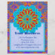 Diseño de arte abstracto - centro de flor con pétalos rojos y naranjas, rodeado de borde azul redondeado, con un patrón de diseño de enredaderas verdes alrededor. Con un fondo con patrón floral abstracto púrpura/naranja.