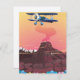 Un avión de apoyo azul vintage volando bajo sobre un volcán.