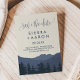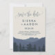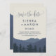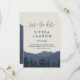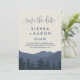 Este retiro a las montañas, salvo la tarjeta de fecha, es perfecto para un boda moderno. El diseño cuenta con una serena cordillera de color azul con un bosque de árboles verdes en primer plano.