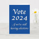 El panorama político americano ha cambiado espectacularmente en las últimas elecciones. Nuestra floreciente democracia de una persona, un voto, está siendo cuestionada por un concepto minoritario de negación de resultados electorales. Es crítico que los estadounidenses amantes de la libertad garanticen su derecho a elecciones libres y justas votando en cada elección, local, estatal y federal, e insistan en que la voluntad del pueblo sea aceptada y no subvertida. Esta declaración de "Vote 2024... si aún estamos teniendo elecciones" es un poco irónica de humor sarcástico, pero tiene el importante mensaje de que nuestro derecho al voto puede estar en peligro.