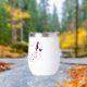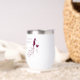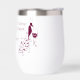 Este diseño humorístico incluye una botella de vino, un vaso y un montón de uvas con el texto: estoy tomando ensalada de fruta para la cena...en su mayoría uvas...bien, todas las uvas...uvas fermentadas... estoy tomando vino para la cena. Estos lentes de vino sin tallo son perfectos para su próxima noche de chicas o barbacoa al aire libre.