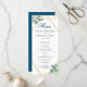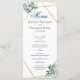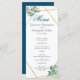 Flores de color azul, rosa y blanco boho en un marco geométrico doble dorado tienen flores botánicas y de bayas. Personalizar este menú boda geométrico con sus propios colores y fuentes o mantenga esta tipografía popular como es para su comodidad. MIx y coincidir con otros elementos de esta hermosa colección de bodas.