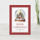 Fotografía color de agua rojo. Tarjeta navideña con Papá Noel dentro de un globo de nieve, hombres de nieve y una casa decorada para Navidades. Personaliza fácilmente esta tarjeta de vacaciones de fotos con nieve roja con tu foto, nombre de familia y texto.