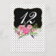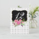Tarjeta numérica de la recepción de bodas colorida, realizada en un fondo blanco, con pequeños puntos de polka negros. Una zona de texto negro decorativa con bordes dorados tiene una hermosa acuarela de flores de peonía rosa, en la parte inferior. Personaliza el número de blanco de cada mesa en la recepción. Hay productos bodas que coinciden.