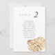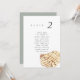 Minimalist and elegant wedding table number seating chart cards featuring a watercolor painting of a seashell. The pairing of the soft watercolor beach scene and the chic typography makes for a beautifully chic combo.