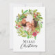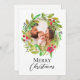 Envíe sus cálidos deseos de vacaciones con esta encantadora tarjeta de Feliz Navidad. Con una hermosa corona acuática y un espacio para tu foto familiar favorita, esta tarjeta captura la esencia de la temporada festiva. Personalízalo con tu apellido y un mensaje sincero para difundir alegría y amor a tus amigos y familia.