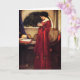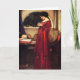 John William Waterhouse la tarjeta de felicitación de la bola de cristal. Pintura al óleo en lona a partir de 1902. El pintor inglés John William Waterhouse del Pre-Raphaelite creó algunas pinturas mitológicas y literarias hermosas. La bola de cristal es un trabajo de acoplamiento que ofrece a una mujer joven en un vestido rojo del terciopelo que fluye que mira fijamente en una bola de cristal. Su pelo oscuro se fija detrás en un bollo, y ella se coloca al lado de un escritorio con un libro, una vara, y un cráneo abiertos al lado de una ventana abierta. Un gran regalo para las fans de J.W. Waterhouse, fantasía, bolas de cristal, los Pre-Raphaelites, y pintura inglesa romántica.
