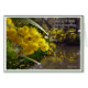 Closeup Golden Wattle se ramifica con flores amarillas. Las aguas a través de un río reflejan maravillosamente en el agua. Una tarjeta preciosa - casi se pueden oler las flores.