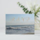 playa de bonito y olas del océano. RSVP está escrito en contra del color marrón claro. destino de playa boda. Fotografía original de TamiraZDesigns.