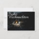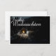 Die Karte zeigt eine stimmungsvolle, winterliche Szenerie mit einer kleinen, beleuchteten Holzhütte inmitten eines verschneiten Waldes. Die warme Lichtquelle im Inneren schafft einen schönen Kontrast zur dunklen, friedlichen Umgebung. Der elegante "Feliz Navidad"-Schriftzug en Weiß verleiht dem Motiv eine festliche Note. 🎄 ✨ Deutsch