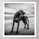 Fotografía en blanco y negro con color sólo en el collar del perro, de un perro de Weimaraner en la playa de pie, mirando hacia atrás.