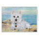 El mar turquesa y la melocotón proporcionan un bello telón de fondo para este Territorio Blanco de la Montaña Occidental en una salida a la playa. Envíe saludos a sus amigos Estilo Westie con belleza y color! ¡Todas las ventas apoyan el rescate de West Highland White Terrier!