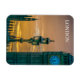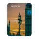 Una hermosa vista de una farola en el puente Westminster en Londres y una vista parcial de la Torre Elizabeth al atardecer impresa en un imán de recuerdo para la nevera.
