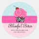 © 2020 Socialite Designs Inc. Whimsical quequito de cerezo con diseño de pegatina de cinta de polka-dot para sellar tus paquetes de panadería. El fondo está decorado con motivos adamascados azules y rosas.