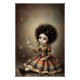 This whimsical dark circus doll illustration captures the mysterious charm of a vintage carnival. With her large expressive eyes, flowing red curls, and striped Victorian-style dress, the doll sits quietly atop a travel trunk surrounded by circus tents, bunting flags, and nostalgic stage props.