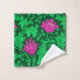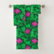 Toalla colocada en un vintage patrón de damasco floral William Morris de flores y hojas anemónicas, hojas verdes de esmeralda realzadas y coloreadas digitalmente y flores en tonos fucsia rosadas sobre un fondo verde esmeralda oscuro