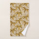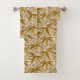 Toalla colocada en una huella vintage de William Morris de hojas y tendrils de bambú, realzada digitalmente y coloreada con un suave efecto de color pastel de textura, tonos de oro de mostaza oscura y marrón rugoso, acentuado con un fondo blanco roto/crema