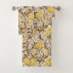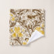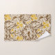 Toalla puesta en un William Morris, Art Nouveau, impresiones textiles de iris y hojas, realzadas digitalmente y coloreadas, en oro mostaza claro y profundo, con hojas marrón chocolate oscuro y tostado, sobre un fondo beige claro