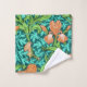 Toalla colocada en un William Morris, Art Nouveau, impresiones textiles de iris y hojas, realzadas digitalmente y coloreadas, en naranja, verde lima y agua suave, sobre un fondo turquesa profundo