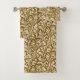 Toalla colocada en un patrón vintage de damasco William Morris de flores y hojas de cardo, en beige claro, sobre fondo de color marrón claro / piedra, realzado digitalmente y colorido