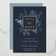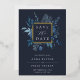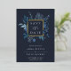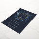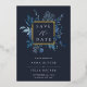 Nuestra boda de Azure invernal salva los marcos de fecha de las palabras "guardar la fecha" con un elegante borde cuadrado de color de agua exuberante en tonos invernal de azul polvoriento, con un recorte real de Relieve metalizado dorado en un fondo azul medianoche. Un enfoque moderno y elegante de la tendencia botánica para bodas de invierno o primavera en azul y blanco fresco.