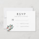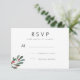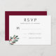Una tarjeta de respuesta/rsvp boda moderna y festiva, con una rama de bayas de color verde y rojo. El respaldo está en sólida borgoña. Los elementos coincidentes de este diseño están disponibles.