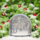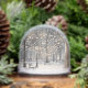 A serene winter night scene snow globe in a snowy park with string lights and park benches in the snow. Set the mood for a cozy holiday with this magical winter scene.