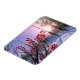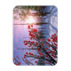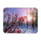 Bayas rojas resplandecientes cubiertas de hielo espumoso contra el telón de fondo de una brillante puesta de sol invernal detrás de árboles desnudos y pinos oscuros.