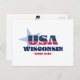 Postal de Wisconsin. Un diseño tipográfico creativo que encapsula la esencia de Wisconsin con colores rojo, blanco y azul audaces y elementos patrióticos, incluidas estrellas y rayas.