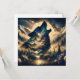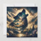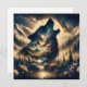 Imagen dentro de una imagen. Un lobo aullando en la luna con un fondo de montaña y bosque.