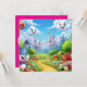 Un conejo azul de aspecto agradable con corbata de arco rojo sonríe ampliamente, rodeado de flores de colores. A su derecha, un lindo zorro rojo también sonríe al espectador. Ambos personajes están situados en un exuberante césped salpicado de flores y champiñones de colores variados, entre ellos un gran champiñón rojo con manchas blancas a la izquierda. Una sinuosa carretera de ladrillos amarillos empieza desde el fondo de la imagen y serpentea por el paisaje, llevando a un castillo de cuentos de hadas con torrecillas rosas a lo lejos. El castillo está rodeado de árboles verdes y colinas onduladas. El cielo es un azul brillante, lleno de nubes esponjosas y antropomórficas con caras sonrientes. En el cielo también se puede ver un pequeño y alegre personaje tipo sol y otras pequeñas figuras lúdicas. El conjunto es luminoso, colorido y muy amigable con los niños, lo que da un toque de alegría y aventura en una tierra mágica.