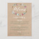 Estos menús son perfectos para cualquier pareja que planee una romántica celebración de bodas en el campo. El diseño presenta una corona de flores silvestres de moda sobre un fondo de efecto kraft con una redacción coordinada en color. El sencillo diseño puede ser personalizado para su evento especial y será el menú perfecto para cualquier fiesta con temas de moda floral, incluyendo duchas de novias, compromisos, duchas de bodas, fiestas de cumpleaños y mucho, mucho más.