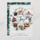 Un diseño festivo de tarjetas de vacaciones que incluye ocho de tus fotos favoritas dispuestas en un diseño de corona circular acentuado por el follaje color agua verde, los conos de pino y las bayas rojas en un fondo de shiplap de madera de una casa de campo blanca. "Alegría" aparece en el centro en la tipografía festiva de escritura de guion con guijarros con letras de color verde. Personalice este diseño único de collage de fotos de vacaciones con los nombres y saludos de sus Navidades personalizados en la parte inferior.