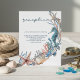 La tarjeta de recepción de bodas de temática playera cuenta con un caballito de mar, una concha de mar, una estrella y un coral con los detalles de tu celebración, como el tiempo y la ubicación en las polvorientas letras azules. Perfecto para la playa, la costa, el mar, el destino y los bodas tropicales. Arte por KL Stock