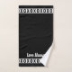Este diseño de toallas de baño de moda incluye una toalla blanca con un borde XOXO blanco y negro en la parte superior e inferior. Presenta las palabras personalizadas "Love Always" en blanco en la parte inferior de la toalla.