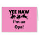 Yee Haw Soy una camiseta Opa, tazas, tarjetas, pegatinas, botones de invitación, bolsitas opa, y otras prendas de opa y regalos con un caballo de buceo y diseño de texto en blanco o negro. Estas prendas de vestir opa y artículos de regalo son perfectas para los abuelos por primera vez o para las opciones de una llegada nueva.