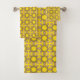 A set of towels displayed in two images. The first shows a towel hanging on a rod, featuring a vibrant yellow and brown geometric pattern. The second shows a washcloth with the same design, partially folded to reveal a white underside. The pattern is repetitive, conveying a modern and energetic tone.