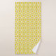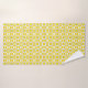 Two towels featuring a yellow and white geometric pattern. The top image shows a towel hanging, while the bottom displays a washcloth partly folded."