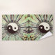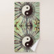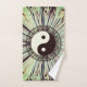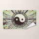 Un deslumbrante prisma trippy como patrón de verdes y marrones mostrando el antiguo símbolo Yin yang armonizado con un decorativo borde esténcil griego. Viajes espirituales de Zen Boho