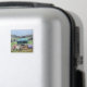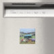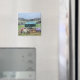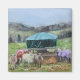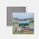 Ovejas coloridas paradas en el campo comiendo heno en este útil imán cuadrado.