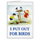 Una imagen caprichosa de niños alimentando pájaros, y hasta disfrutando de la compañía de una ardilla hambrienta. Leyenda: "PONGO AVES". Una tarjeta linda para los amantes de las aves que apagan.