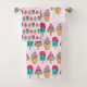 Toalla estampada con un ilustracion de 3 helados diferentes. Popsicle azul-verde con goteo de fresas y rociadores coloridos. Una pala de sandía. Un cono con capas de deliciosos helados en rosa y menta. Todo con sonrisas kawaii lindas.