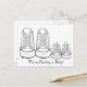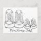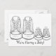 La postal presenta un par de zapatillas de tamaño adulto junto a un par de zapatillas de tamaño infantil. ¡Perfecto para anunciar tu nueva llegada! Versión para niño (fondo azul) y versión para niña (fondo rosa) y pegatinas coincidentes también disponibles. El texto también se puede personalizar para fiestas de bebé y anuncios de nacimiento.
