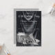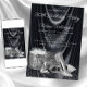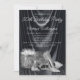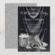 Invitación de cumpleaños para mujer negra y plateada con zapatos de tacón alto plateados, frasco de perfume y regalos sobre un hermoso fondo de satén negro. Esta invitación de cumpleaños para mujer negra y plateada se personaliza fácilmente para su evento simplemente agregando los detalles de su evento.