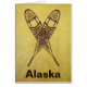 Un par de raquetas cruzadas sobre un fondo de cuero de cerebro. También aparece un texto de personalizable que dice "Alaska". Hay varios estilos diferentes de raquetas de nieve tradicionales. Los que aparecen aquí son de Ash y moosehide babiche (webbing) en el patrón de Alaska. Las raquetas de nieve de Alaska, más largas y más delgadas que otros estilos, como el pepino, permiten una puerta más natural y son perfectas para los viajes de travesía. Las puntas ligeramente volteadas te permiten arrastrar un poco los pies. Se aconseja llevar raquetas de nieve para los excelentes cielos; generalmente en el peor momento posible.