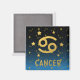 imán personalizado para "Cáncer" con símbolo zodiaco dorado y estrellas doradas con fondo de gradiente azul y negro. Disponible en varios tamaños.
