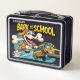 Esta enérgica lonchera muestra a un perro caricaturista con una expresión determinada, corriendo hacia un autobús escolar con forma de hueso. El diseño capta la emoción y anticipación del día escolar. "DE VUELTA A LA ESCUELA" está escrito en un tipo de letra dinámico, con inclinación hacia delante. Perfecto para los niños que siempre están de viaje.