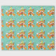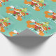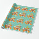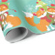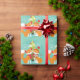 El papel de embalaje lindo y colorido del día de fiesta ofrece dos zorros rojos en orejeras, gorras del invierno, y bufandas rayadas delante de un árbol de navidad adornado con los copos de nieve blancos bonitos.